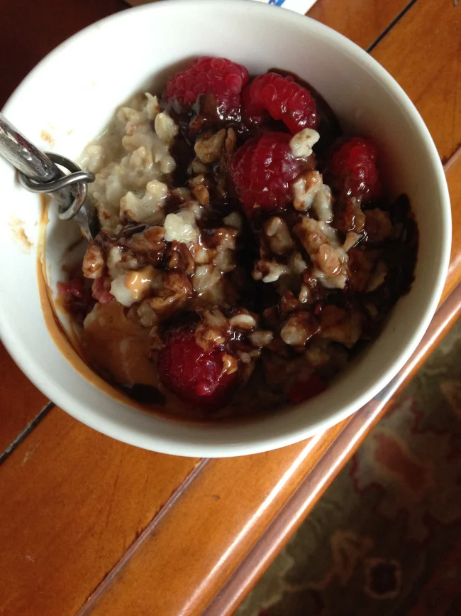 Cook your oatmeal. Put it in a pretty bowl (it’s all about presentation). Add fresh raspberries (I’ve also used bananas). 1 tsp of your favorite peanut butter (I’ve tried almond butter but it’s just not as delicious). 1 tsp of your favorite Nutella-esque spread (Justin’s makes a healthier version, but it’s just a tsp, so go to town). Sit down and enjoy!
